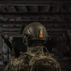 MM14迷彩パターンのカバーを装着したヘルメットを被った茶トラ猫のパッチです。ヘルメット側面にはウクライナ国旗が描かれています。1日も早くこの戦争が終結し、兵士たちが何の気兼ねもなくモフれる日が来るといいですね。