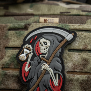 同社のデザインにもよく登場する死神をモチーフにしたパッチになっています。その名も「TIME/時間」です。砂時計を手にした死神は、左手に鎌を抱えています。兵士にとって、決断のためにかけられる時間は限られています。訓練によって高めてきた技量は、たとえ実戦によって熟練の域に達したとしても、その最後は運に左右されてしまいます。次の一手が生死を分かつ時、生き残れるのは自分なのか、それとも……。